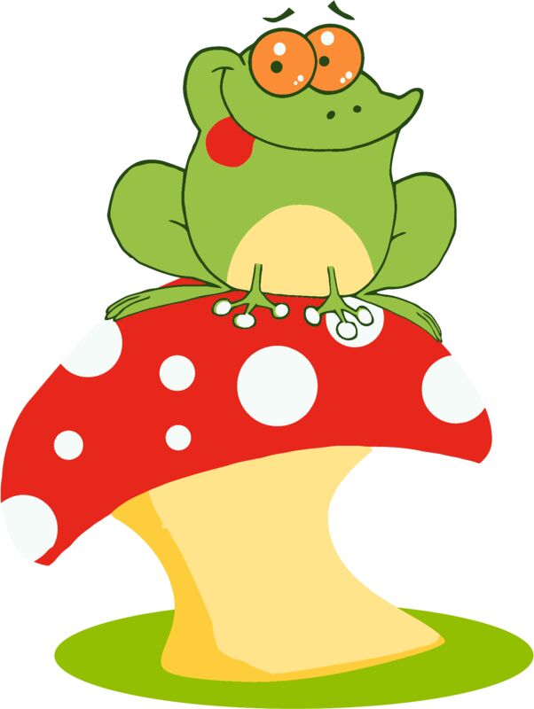 green frog sitting on toadstool red white